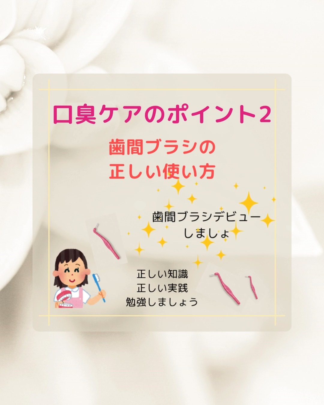 富山県射水市の歯医者、大谷歯科医院です。 今回は、【口臭ケアのポイント2】歯間ブラシの正しい使い方のポイントをご紹介します。 歯間ブラシは、歯ブラシでは届きにくい歯と歯の間や、歯と歯ぐきの境目の歯垢(プラーク)を取り除くのに非常に効果的です。 歯間ブラシを使用する際は、鏡を見ながら行うと安全です。 1.挿入角度に注意する ・上の歯: 歯間ブラシの先端をやや下向きに。 ・下の歯: 歯間ブラシの先端をやや上向きに。 ・歯ぐきを傷つけないよう、無理なくスムーズに入る角度を探してください。 2.無理なく挿入する ・歯間にゆとりを感じる程度のサイズを選び、力を入れずにゆっくりと挿入します。 ・ブラシの毛のある部分だけを挿入しましょう。 ・歯に添わせるように挿入します。 3.1本ずつ磨く ・2本の歯を同時にではなく、1本ずつ1ヶ所ずつ磨きます。 ・1本ずつ歯に添わせて磨くことで、歯ぐきを傷つけずに綺麗に磨くことが出来ます。 4.やさしく動かす ・歯間ブラシを2~3回、前後に(水平に)動かしてプラークを取り除きます。 ・金属ワイヤーが曲がったり折れたりする原因になるため、かき回すような動かし方は避けてください。 5.ゆっくりと抜く ・抜くときも、勢いよく引っ張らず、ゆっくりとまっすぐに抜き取ります。 6.奥歯への使用 ・L字型の歯間ブラシを使用するか、I字型の場合はL字型に曲げて使用すると、奥歯にも挿入しやすくなります。 7.清掃過程 ・歯間ブラシについた汚れは、水で洗い流したり拭き取ったりしながら、次の歯間へ移ります。 ・それぞれの歯の間、奥歯の後ろも忘れずに‼ お悩み事、気になる事などお気軽にご相談ください。 https://dent-ohtani.jp/ 大谷歯科医院 富山県射水市戸破750-1 0766-56-3883 #大谷歯科医院#射水市歯医者#射水市歯科医院#富山県歯医者#富山県歯科医院#google