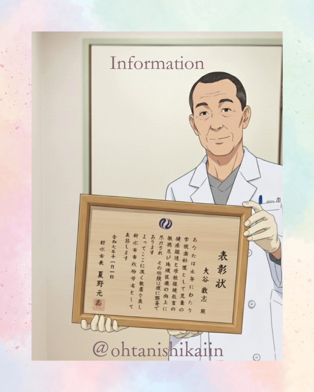 富山県射水市の歯医者、大谷歯科医院です。 この度、院長が功労賞をいただきました。 これもひとえに、大谷歯科医院に通ってくださる患者様、いつも支えてくれているスタッフ、関係者の皆様のおかげです。 これからも患者様の「歯や歯から身体への健康」に尽力してまいります。 変わらぬご指導、ご鞭撻をよろしくお願いいたします。 本当にありがとうございました。 大谷歯科医院 富山県射水市戸破750-1 0766-56-3883 気になる事、お悩み事などお気軽にご相談ください。 #富山県歯科医院#射水市歯科医院#google