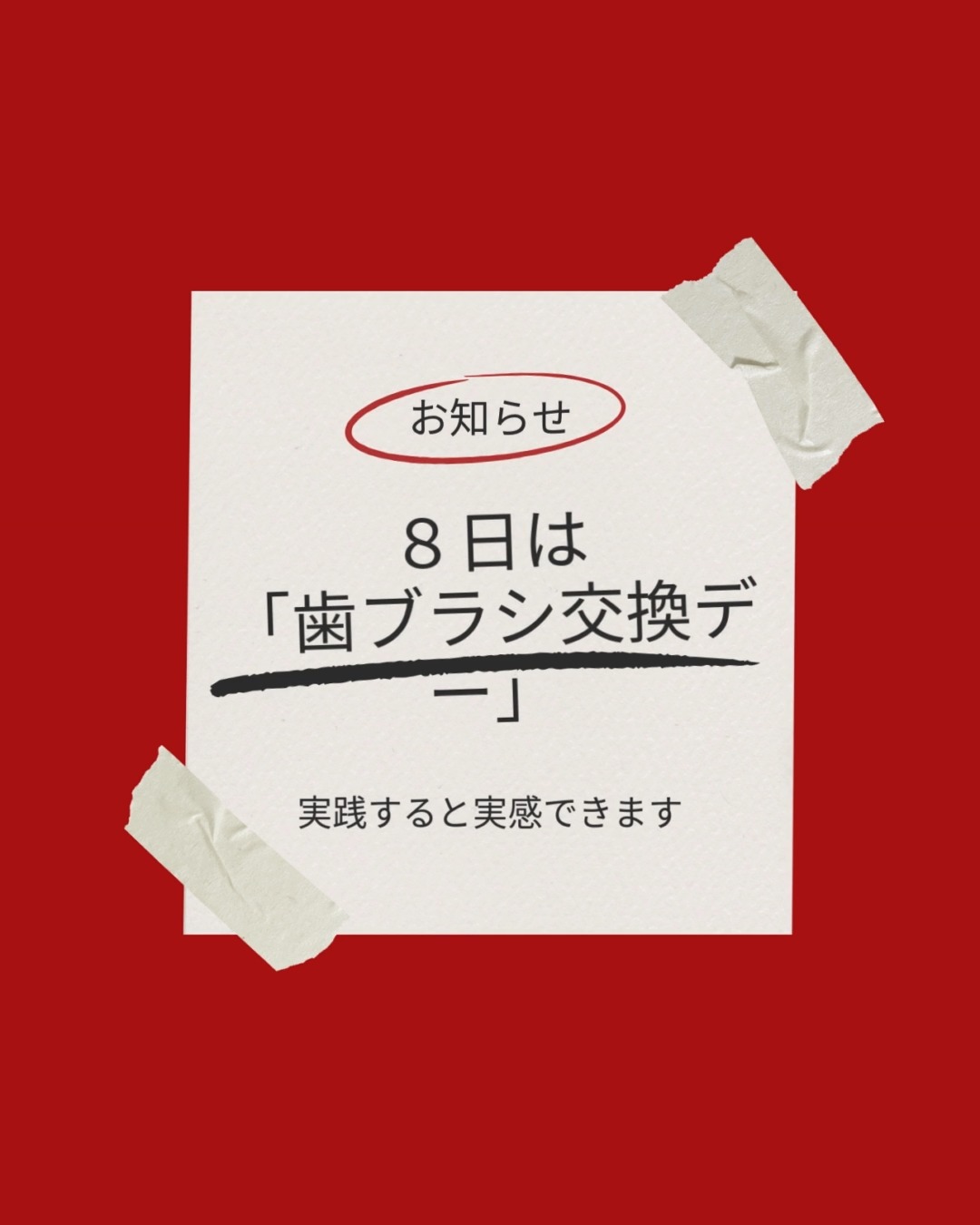 富山県射水市の歯医者、大谷歯科医院です。 歯みがきの効果を最大限に! 毎月8日は歯ブラシ交換でピカピカの歯に‼ 実践すると実感できます。 毎月8日を「歯ブラシ交換デー」とし、 1ヶ月に1度歯ブラシを交換する習慣を推奨しています。 お悩み事、気になる事などお気軽にご相談ください。 https://dent-ohtani.jp/ 大谷歯科医院 富山県射水市戸破750-1 0766-56-3883 #大谷歯科医院#射水市歯医者#射水市歯科医院#富山県歯医者#富山県歯科医院#google