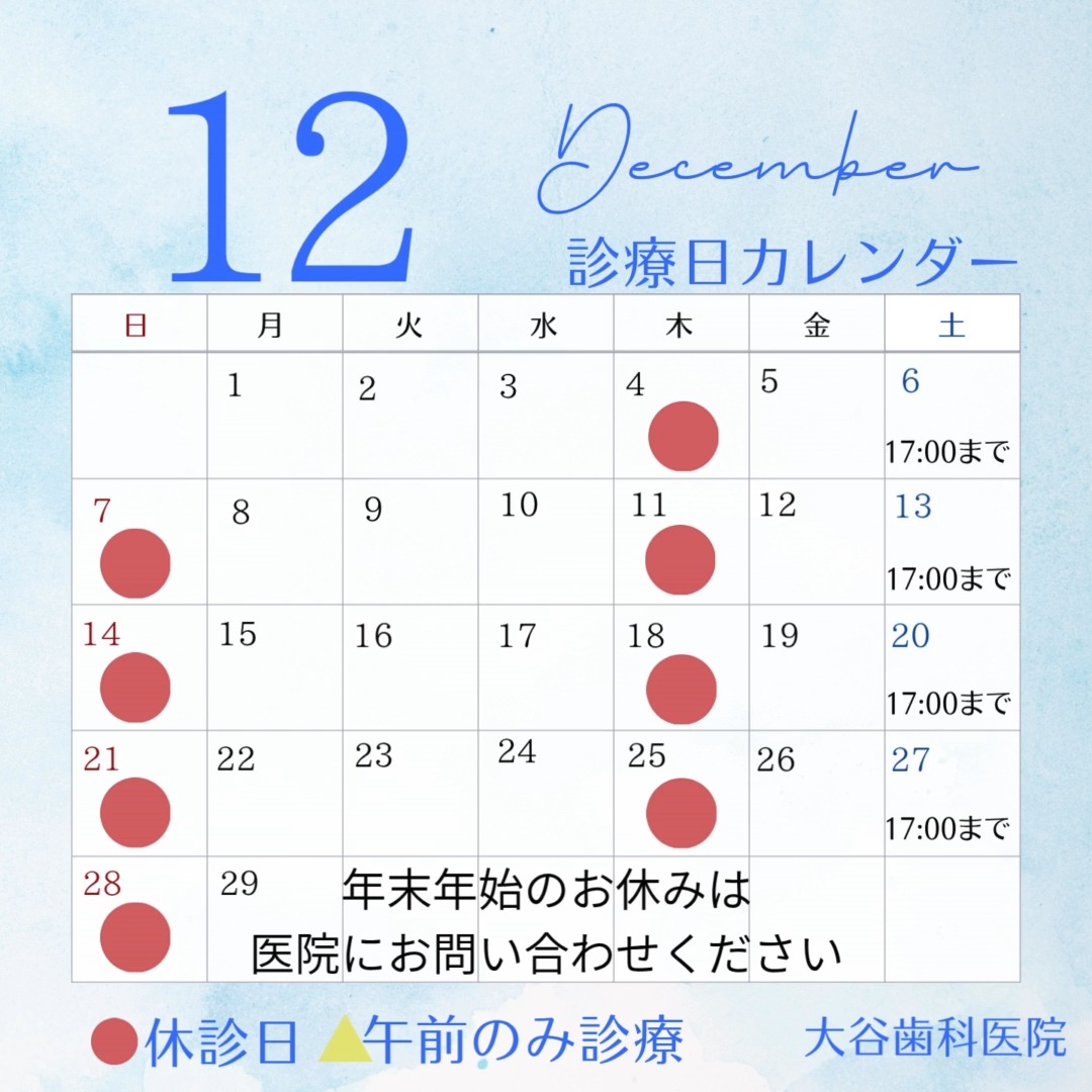 富山県射水市の歯医者、大谷歯科医院です。 2025年12月の診療日のお知らせです。 年末年始のお休みは 医院にお問い合わせください。 大谷歯科医院 富山県射水市戸破750-1 0766-56-3883 気になる事、お悩み事などお気軽にご相談ください。 #富山県歯科医院#射水市歯科医院#google