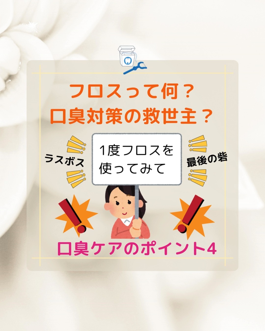 富山県射水市の歯医者、大谷歯科医院です。 口臭ケアのポイント4 フロスって何?口臭対策の救世主? 初めて聞いたっていう方もいるのではないでしょうか? フロスとは? 口腔内清掃に使う「フロス」は、正式には「デンタルフロス」と呼ばれています。 歯ブラシでは、届きにくい歯と歯の間(歯間)の歯垢(プラーク)や食べかすを 取り除くための細い糸状の清掃器具です。 歯ブラシが届きにくい歯間部や歯と歯茎の境目(歯肉溝)に 入り込んだ汚れを効率よく除去します。 「デンタルフロスの4つの主な効果」 ・プラーク除去率の向上 ・虫歯・歯周病の予防 ・口臭の予防・改善 ・口腔内トラブルの早期発見 口臭予防・改善が期待できます。 ・プラーク除去率の向上 歯ブラシだけでは約60%程度しか歯垢が取れませんが、 デンタルフロスを併用することで、80%前後まで除去率が上がるとされています。 ・虫歯・歯周病の予防 虫歯や歯周病の原因となる歯垢をしっかり取り除くことで、予防に大きく役立ちます。 ・口臭の予防・改善 汚れが原因で起こる口臭の予防に効果的です。 「フロスを使うようになってから、いつの間にか口臭を気にすることが少なくなりました♪」 このような声も聞きます。 「虫歯がないのに口臭がする」 「定期健診に行っているのに口臭がなくならない」 「ちゃんと歯磨きをしているのに口臭が気になる」 このようなお悩みのある方は、試してみる価値ありです! 口臭でお悩みのあなた! 1度フロスを使ってみてください。 次回はデンタルフロスの種類をご紹介します。 正しい知識・正しい実践が大切です。 毎日のケアで、歯の健康を守りましょう。 実践すると実感できます。 お悩み事、気になる事などお気軽にご相談ください。 https://dent-ohtani.jp/ 大谷歯科医院 富山県射水市戸破750-1 0766-56-3883 #大谷歯科医院#射水市歯医者#射水市歯科医院#富山県歯医者#富山県歯科医院#google