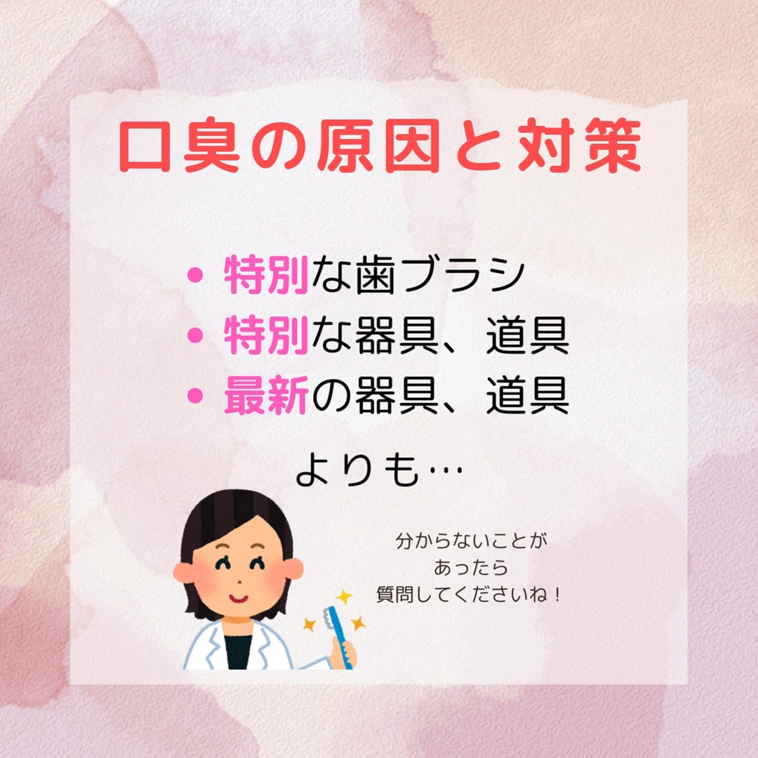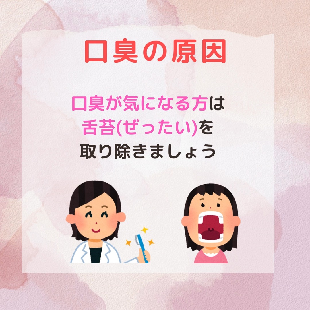 富山県射水市の歯医者、大谷歯科医院です。 口臭について 「さよなら口臭」を目指して、口臭の原因と対策を知りましょう。 第2弾は「口臭の原因と対策」の「お口の健康状態によるもの」を 一緒にお勉強しましょう。 お口の健康状態によるもの ・歯周病や虫歯がある時 ・舌苔の放置 が原因で、非常に強いニオイがすることがあります。 歯周病や虫歯がある時 ・毎日のオーラルケア ・定期的な歯科検診 が、とても大切です。 舌苔の付着も、毎日のオーラルケアにより 軽減することができます。 毎日のオーラルケア ・丁寧なブラッシング ・フロス・歯間ブラシの使用 ・舌クリーニング 特別なことではなく、丁寧なケアを 習慣にすることが大切です。 丁寧なブラッシング ・歯と歯ぐきの境目を意識して磨く ・1本ずつを意識して磨く ・細かく動かして磨く ・歯ブラシの握り方を変える 急がず!力を抜いて‼リラックスして!‼ 行いましょう。 フロス・歯間ブラシの使用 歯垢(プラーク)の8割は、歯間に潜んでいる と言われています。 フロスや歯間ブラシを使うと、お口の中のさっぱり感が 持続しやすいです。 私も、フロスを使ってからいつの間にか 口臭が気にならなくなりました。 舌クリーニング 専用の舌ブラシやタングスクレーパーで 「舌苔(ぜったい)」をやさしく取り除きます。 (やりすぎは注意) 歯ブラシと同じように、優しく行いましょう! 舌クリーニング 体調や体質により舌苔がつきやすい方は、 舌クリーニングをお試しください。 舌の表面につく舌苔は、 胃腸の状態を反映すると言われています。 そんな方には、タングスクレーパーがお勧めです。 あなたの舌は、どのような状態ですか? 観察してみて下さいね。 虫歯、歯周病、口臭など歯に関すること 気になる事やお悩み事など、お気軽にご相談ください。 大谷歯科医院 富山県射水市戸破750-1 0766-56-3883 #大谷歯科医院#射水市歯医者#射水市歯科医院#富山県歯医者#富山県歯科医院#google