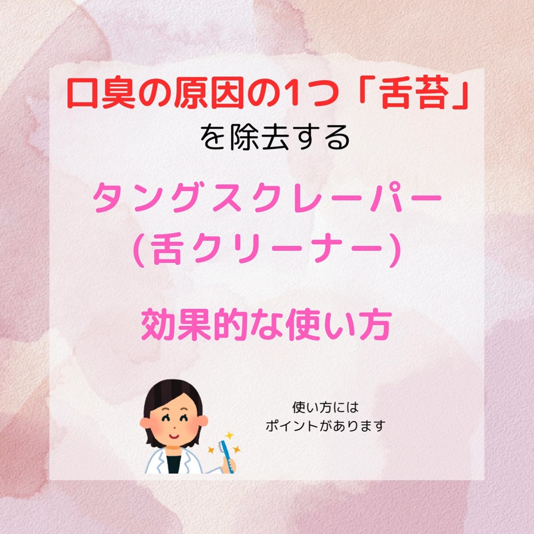 富山県射水市の歯医者、大谷歯科医院です。 「口臭」でお悩みの方はいませんか? 今回は口臭の原因の1つ、 舌苔(ぜったい)を取り除く ・「タングスクレーパー」の効果的な使い方 ・お勧めのタングスクレーパー についてご紹介します。 歯ブラシを使うのはおすすめしません。 歯ブラシを使うと舌を傷つけたり、 逆効果になる場合があります。 専用の舌ブラシやタングスクレーパーを使いましょう。 タングスクレーパー(舌クリーナー)効果的な使い方 ・起床直後や朝食前に使用します。 ・起床直後には、悪臭の強い舌苔が多くついています。 ・水でうがいをした後に舌に垂直にあてます。 ・ゆっくりと優しく2∼3回舌苔をかき出します。 ・圧が強すぎると味蕾を傷つける恐れがあるので、 優しくソフトに取りすぎないように行います。 ・朝に限らず、いつでも気軽に使えるので便利です。 大谷歯科医院では、使いやすさや効果を考えた上で タングスクレーパー(チタンくん)をお勧めしています。 タングスクレーパー(チタンくん)は、 舌の味蕾の間に溜まったバクテリアの腐敗代謝産物を除去し、 口臭予防や口臭を軽減します。 「チタンくん」とは 生体に最も親和性のある純チタンで作られています。 チタンは、ガルバニック電流を吸収してくれる物質と 言われています。 従来のタングスクレーパーには、 銀やステンレスが使用されているものがあります。 銀製製品は、アレルギー体質の方は 使用を控えたほうがいいです。 ステンレスにはアルミが含まれているので、 使用を控えたほうがいいです。 口臭の原因の1つ「舌苔」を除去する タングスクレーパー(舌クリーナー)を 是非、お使いください。 虫歯、歯周病、口臭など歯に関すること 気になる事やお悩み事など、お気軽にご相談ください。 大谷歯科医院 富山県射水市戸破750-1 0766-56-3883 #大谷歯科医院#射水市歯医者#射水市歯科医院#富山県歯医者#富山県歯科医院#google